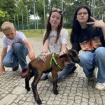Doch nicht nur unter Wasser gab es spannende Begegnungen: Plötzlich tauchte am Ufer eine Spaziergängerin auf – und führte ein Schaf, genauer ein Kamerunschaf, an der Leine. Das Kamerunschaf namens Thor war der Star des Tages und wurde natürlich sofort von allen gestreichelt. Die Besitzerin erzählte uns, dass Thor von seiner Mutter verstoßen wurde und deshalb mit der Flasche aufgezogen werden musste. Romy und Pia, die uns am Angelplatz besuchten, waren so begeistert, dass sie Thor am liebsten gleich mit nach Hause genommen hätten. Nach einer ausgiebigen Kuschelrunde durfte Thor dann aber wieder mit seiner Besitzerin weiterziehen.