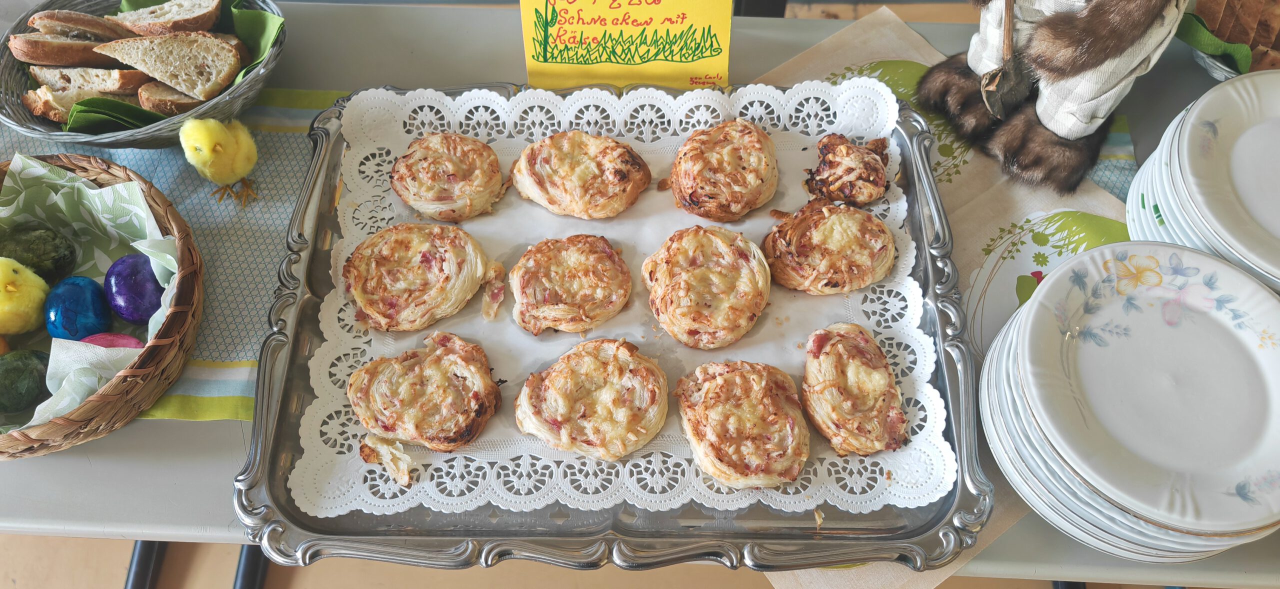 Von Pizzaschnecken, über gefüllte Teigtaschen bis hin zu den süßen Leckereien- wie die „fluffigen Osterhasen“ – war die Auswahl vielfältig und spiegelte die unterschiedlichsten Geschmäcker und Vorlieben unserer Schülerinnen und Schüler wider.